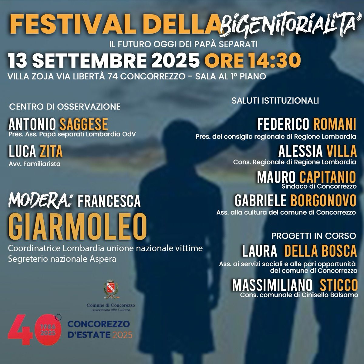 Il 13 settembre 2025, sempre a Villa Zoja, si terrà il "Festival della Bigenitorialità". L'evento, intitolato "Il futuro oggi dei papà separati", avrà inizio alle 14:30. Tra i relatori figurano Luca Zita, avvocato familiarista, e Antonio Saggese, presidente dell'associazione Papà separati Lombardia Odv. Il festival sarà moderato da Francesca Giarmoleo.