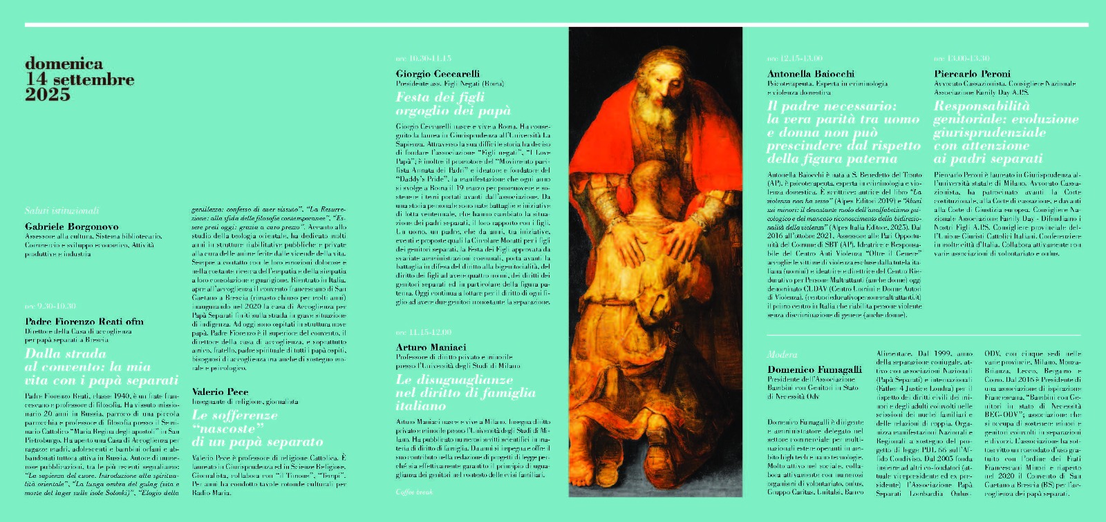 - P. Fiorenzo Reati ofm, direttore della Casa di Accoglienza per Papà Separati a Brescia, condividerà la sua esperienza nell'aiutare padri in difficoltà a ricostruire la loro vita.